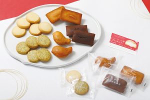 「パティスリーピネード」の定番焼き菓子『幸せ届けることりマドレーヌ』3個、『フィナンシェ』3個、『チョコフィナンシェ』3個、『クッキー バニラ』6枚、『クッキー 紅茶』6枚、創業当時から愛されている『シュークリーム』の引き換えチケット※3 1枚をセットにしました。
