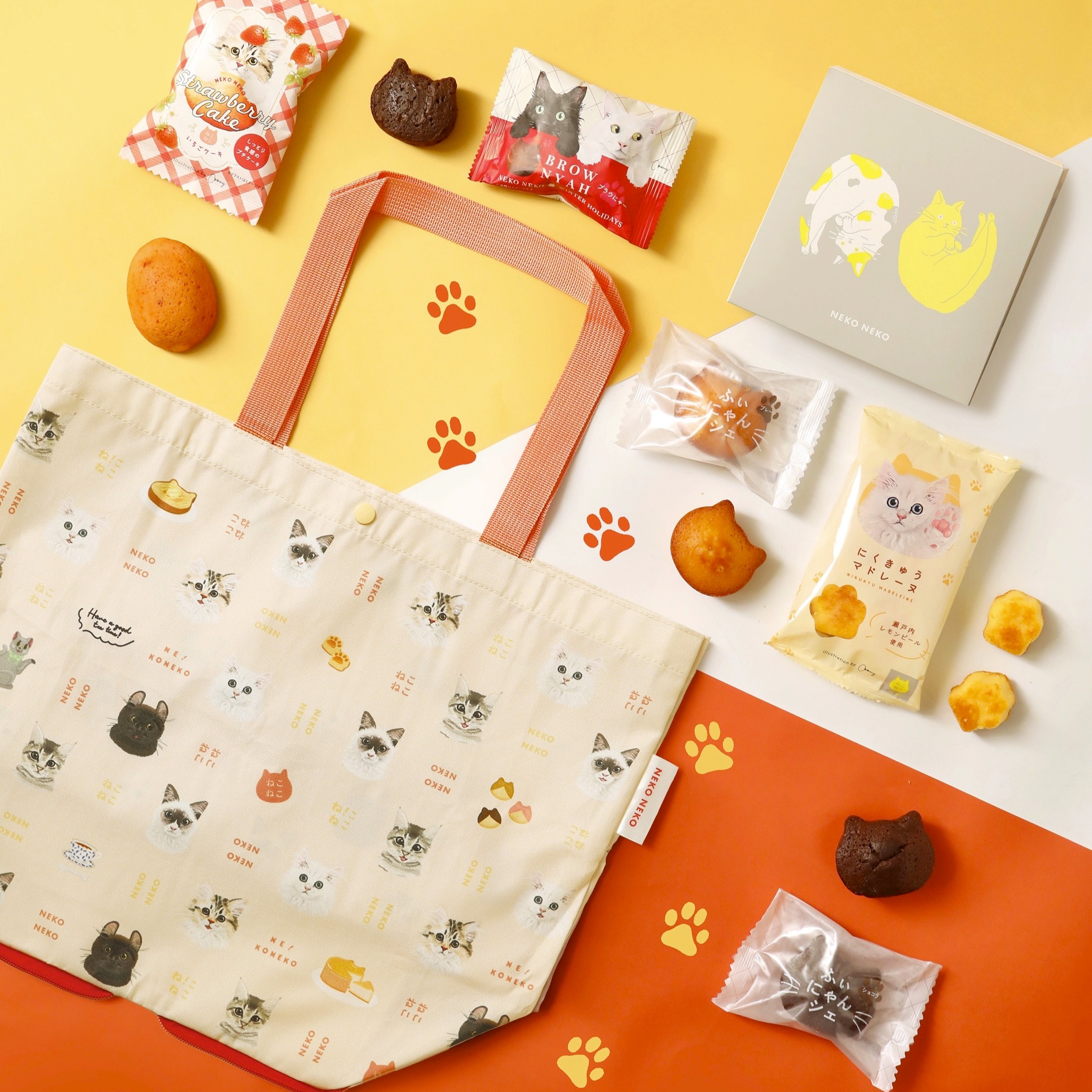 持ち運びに便利な『ね!こねこコンパクトエコバッグ』と『ふぃにゃんシェ 4個入(プレーン/ショコラ)』1箱、”黒ねこ”をモチーフにした『ブラウにゃー』2個、新商品の『ねこねこいちごケーキ』2個、『にくきゅうマドレーヌ』1袋と各ブランドの人気商品と引き換えできるプレゼントチケットを詰め合わせました。