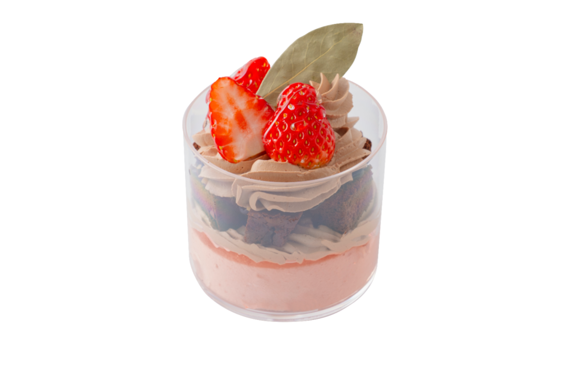 ふんわりとした苺ムースに苺ゼリーとチョコクリーム、一口サイズにカットしたガトーショコラを重ね、仕上げにチョコクリームとフレッシュな苺を飾り付けました。