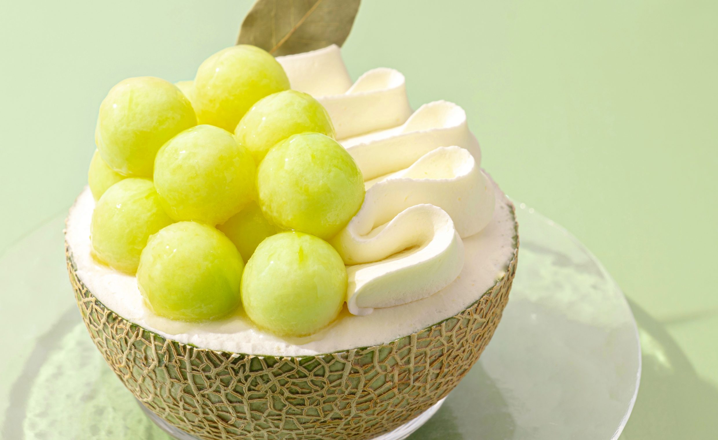 まるくくり抜いたメロンを飾り付け、見た目からも涼やかで華やかな印象を与える季節限定のケーキです。