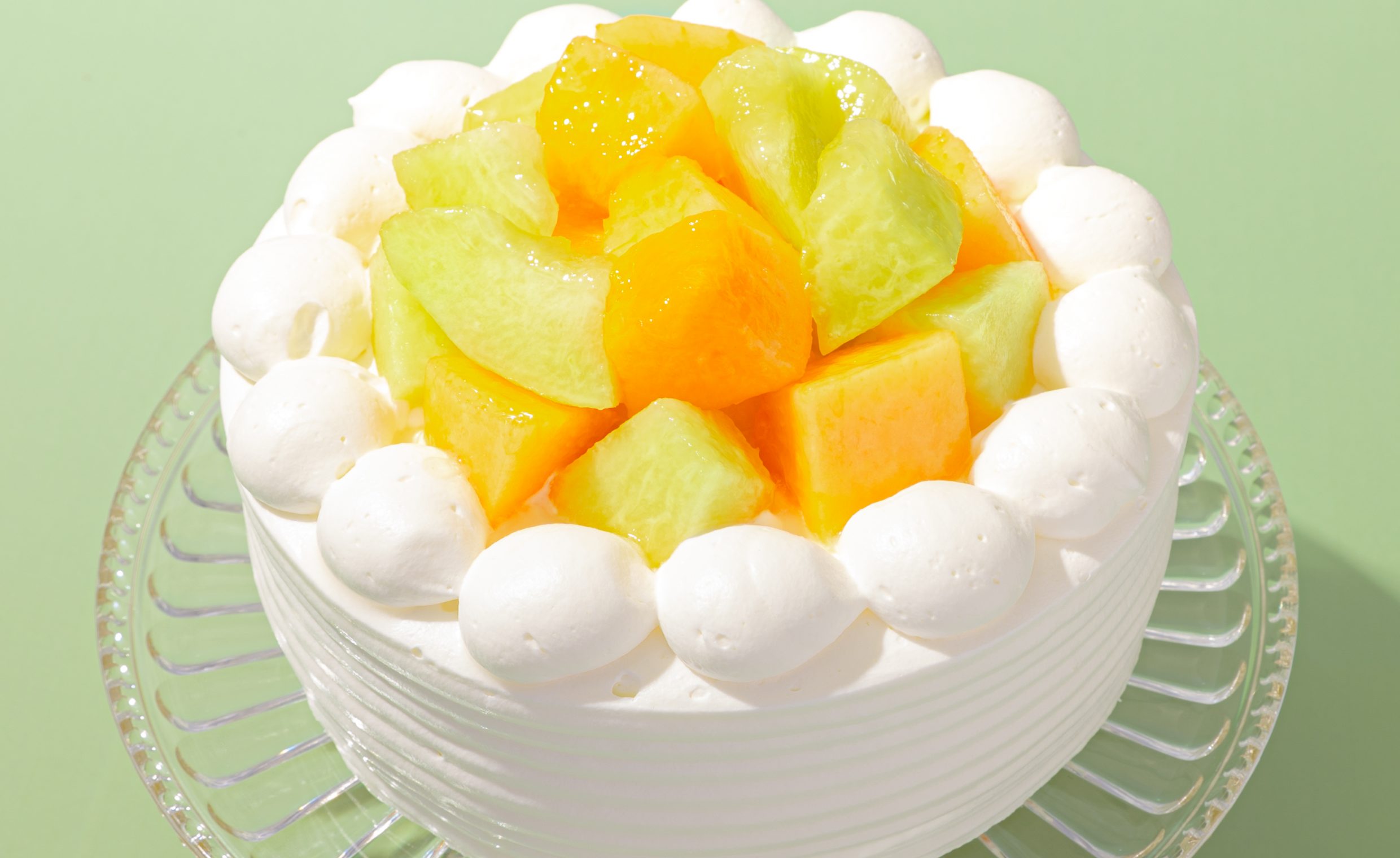 ふわふわのスポンジケーキに、なめらかなホイップクリームと赤肉・青肉メロンをサンドし、表面にもメロンを盛り付けて艶やかに仕上げました。