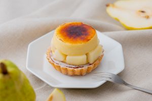 香ばしく焼き上げたタルト生地の上に、ラ・フランスと口どけの良いシブーストムースを重ね、表面をこんがりとキャラメリゼして仕上げました。